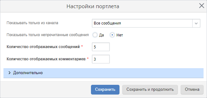 Количество отображаемых сообщений * – максимальное количество сообщений, отображаемых на портлете.