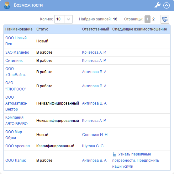 Нажав кнопкой мыши на название портлета, пользователь попадет в раздел Возможности – Потенциальные клиенты.