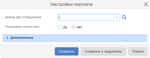 При необходимости установки дополнительных настроек нажмите кнопкой мыши на кнопку Дополнительно и заполните все необходимые поля. Подробнее см. в разделе Настройки портлетов.