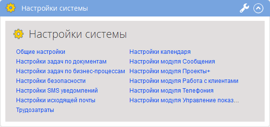 Данный портлет предназначен для администратора системы ELMA. Содержимое портлета позволяет быстро переходить к различным настройкам системы ELMA: общим настройкам работы веб-приложения, календаря, модуля "Работа с клиентами", некоторым настройкам работы с документами, задачами и т.д..