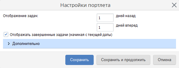 Отображение задач – укажите за сколько дней вперед и назад от текущей даты будут отображаться задачи на портлете.