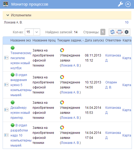Отображать по …– требуется настроить отображение информационных блоков, таких же как на странице монитора процесса. Внутри информационных блоков формируются локальные фильтры (например, по исполнителям или по статусам), которые также применимы к таблице с экземплярами процесса. Для того, чтобы сбросить данные фильтры при просмотре портлета, необходимо обновить страницу в веб-приложении.