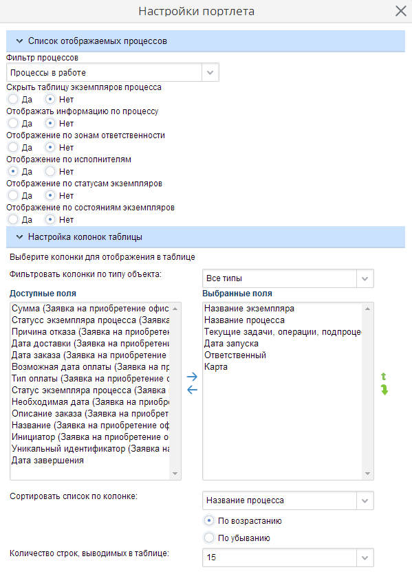 Настройка колонок таблицы– выберите колонки, необходимые для отображения в таблице экземпляров процесса на портлете.