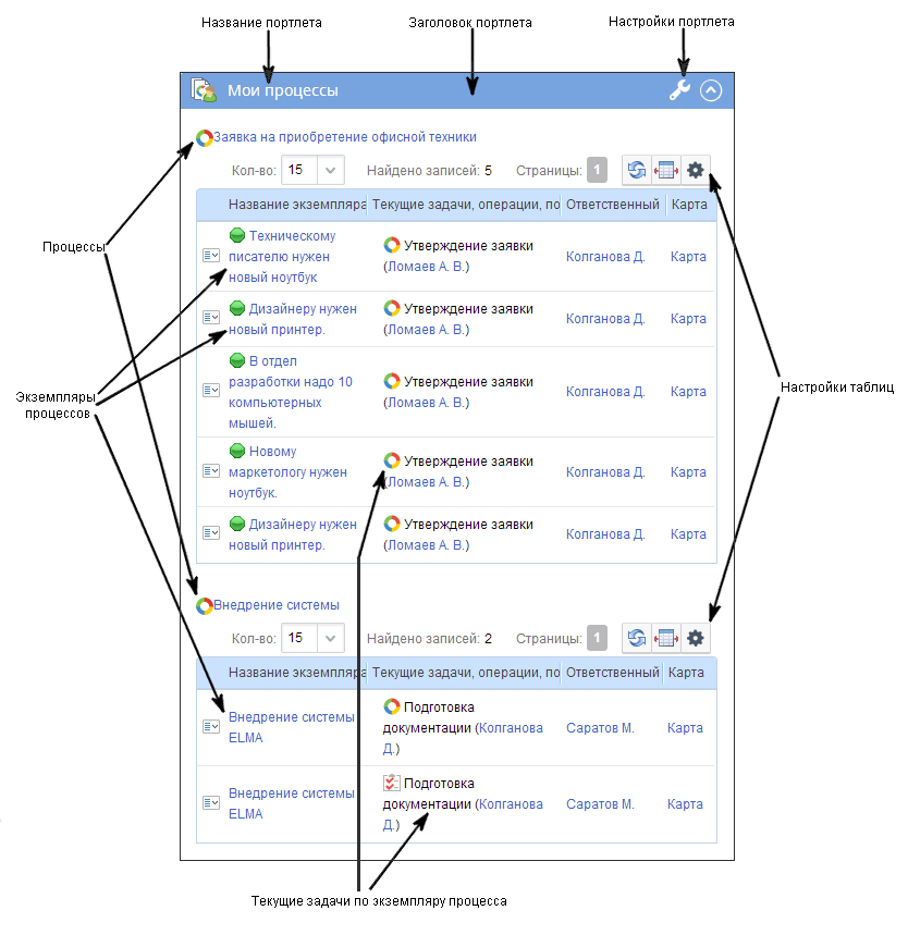 На портлете Мои процессы (рис. 1) отображается список всех запущенных экземпляров процессов, к которым пользователь имеет непосредственное отношение, т.е. в которых он является инициатором, участником или ответственным, а также текущие задачи по процессам и их исполнители.