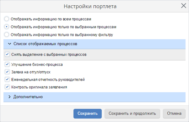 Отображать информацию по всем процессам– на портлете будут отображаться все процессы из раздела Мои процессы и их экземпляры. Если экземпляров по процессу нет, то будет выведено название процесса с сообщением об отсутствии экземпляров.