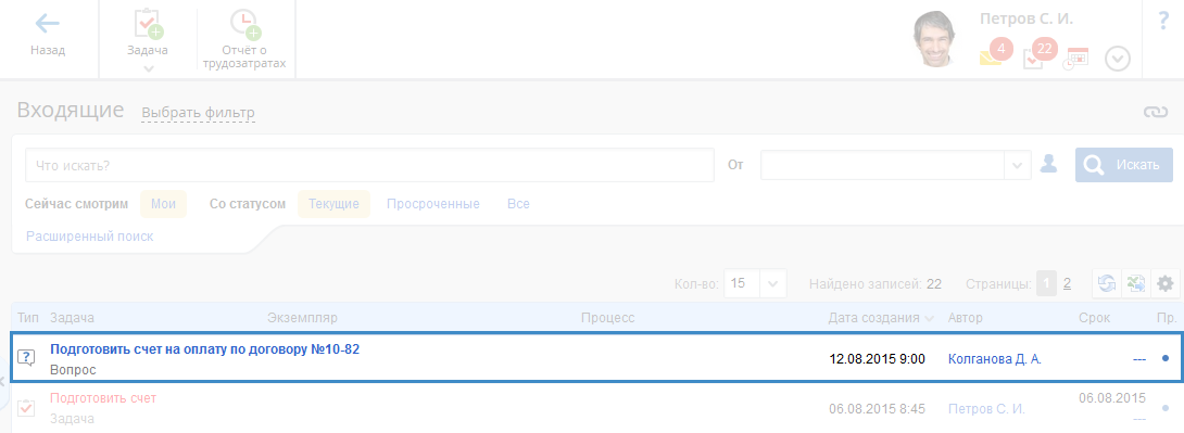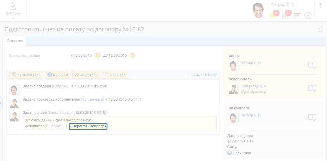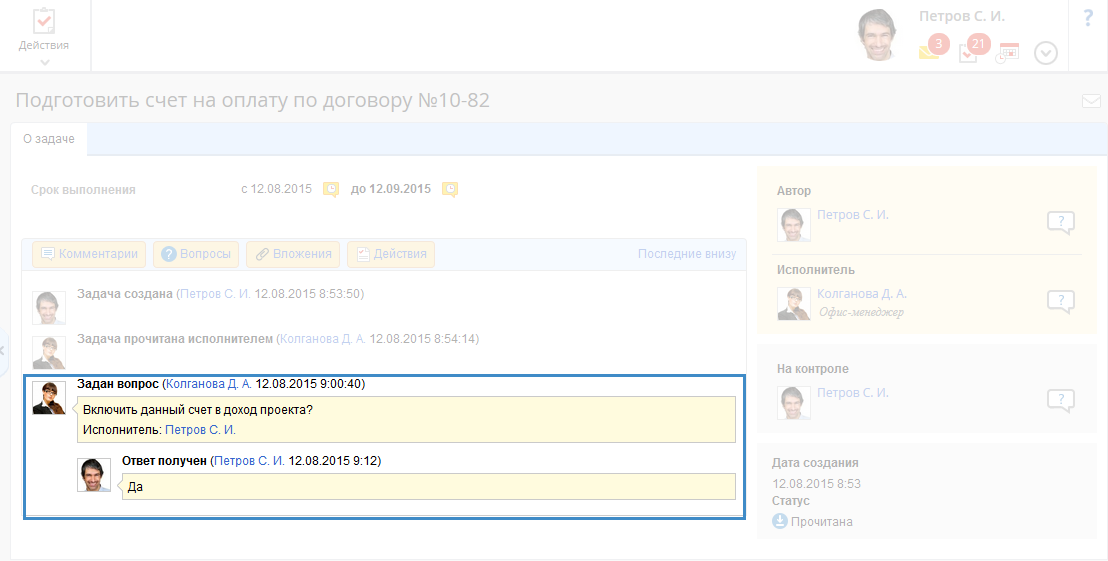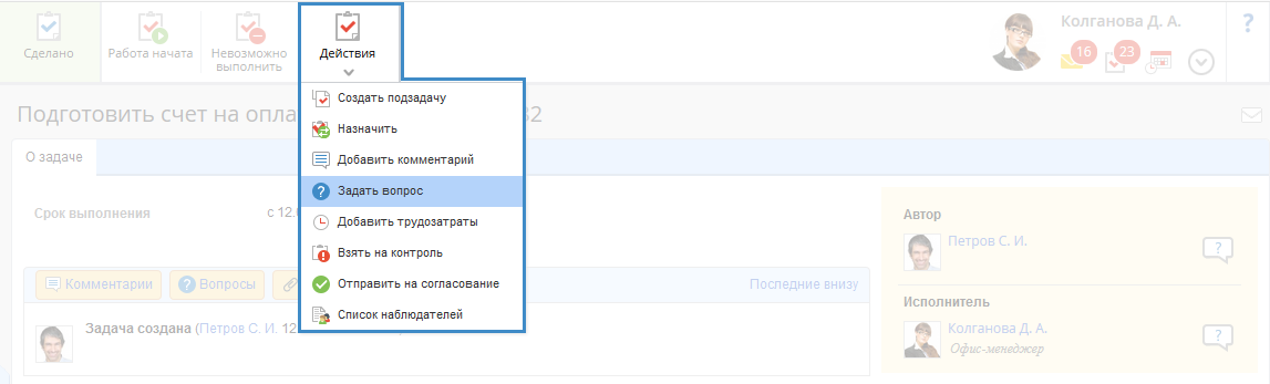 Возможностью задать вопрос по задаче обладают все ее участники. Для этого на верхней панели инструментов страницы (рис. 1) необходимо нажать кнопку Действия – Задать вопрос.