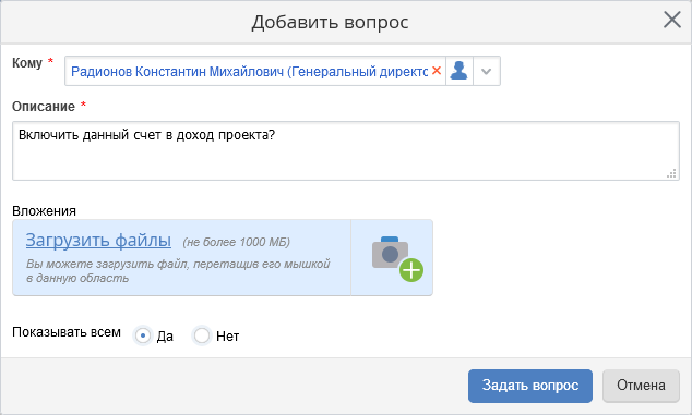 Если в системе ELMA необходимо уточнить информацию у других пользователей, то можно воспользоваться функцией “Задать вопрос”.