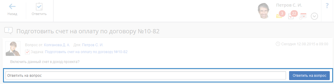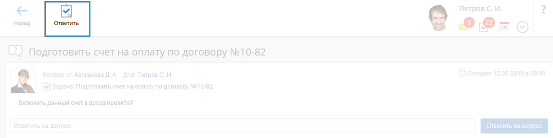 Вопрос приходит в виде задачи пользователю, которому он адресован. В списке задач данный вопрос отображается в группе входящих задач и обозначается пиктограммой со знаком вопроса