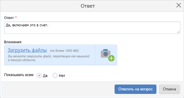 2. Расширенная форма ответа. Вверху страницы, на панели инструментов нажмите на кнопку Ответить (рис. 6). Откроется окно расширенной формы ответа (рис. 7). В поле Ответ изложите содержание ответа. Если к ответу необходимо приложить файл с компьютера, то щелкните мышью по надписи Загрузить файлы либо перетащите файл в данную область. Переключатель Показывать всем аналогично подобной настройке при создании вопроса настраивает отображение на странице задачи ответа для участников. После заполнения необходимых полей нажмите на кнопку Ответить на вопрос.