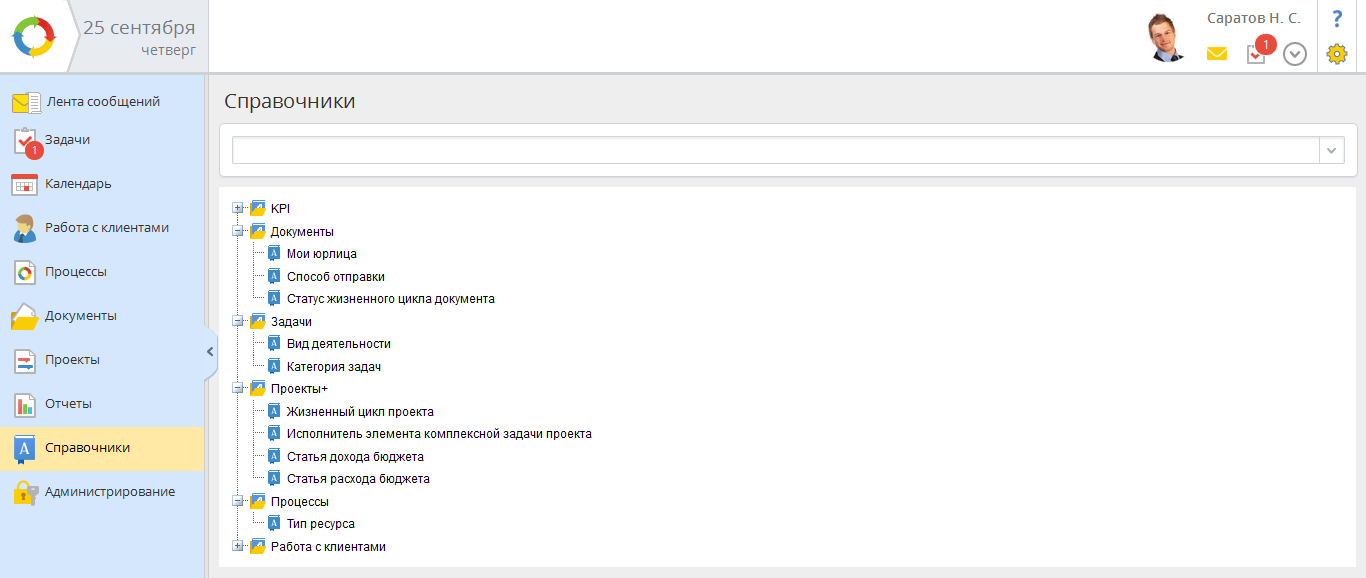 Справочники – это объекты системы с заданной структурой, представляющие собой список однотипных записей со значениями их атрибутов. В системе ELMA они отображаются в соответствующем разделе левого меню (рис. 1).