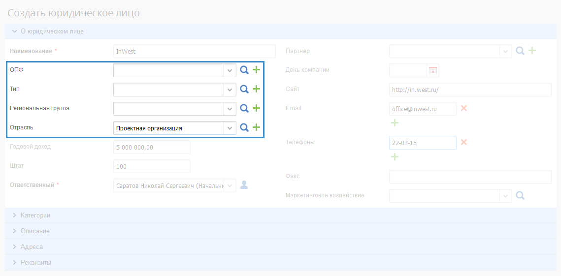 Элементы справочников доступны для выбора в различных полях объектов системы. Например, на форме создания контрагента (рис. 7) в полях ОПФ, Тип, Региональная группа, Отрасль в выпадающих списках появляются записи соответствующих справочников: Организационно-правовая форма, Тип клиента, Регион контрагента, Отрасль.