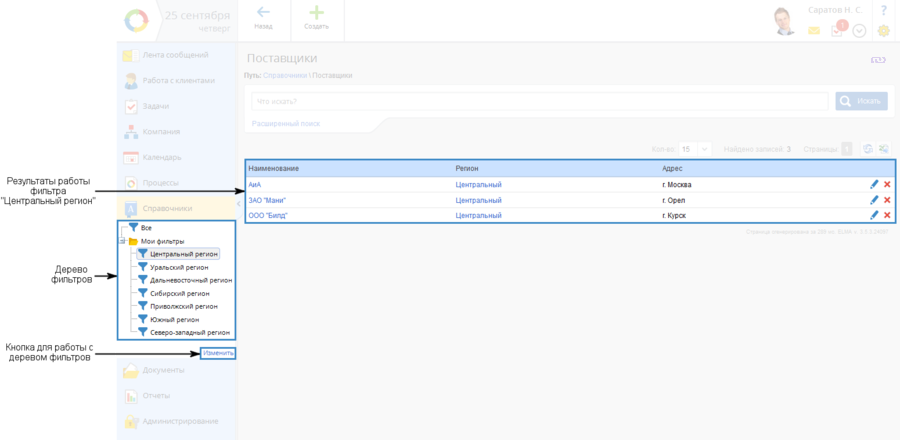 Созданные фильтры отображаются в дереве фильтров в левом меню. Каждый фильтр производит выборку записей справочника в соответствии с заданными условиями. Таким образом, нажимая кнопкой мыши на названия фильтров, можно быстро увидеть результаты поиска по ним. Также доступна возможность создания фильтра без сохранения, который позволяет делиться ссылкой на текущий поиск с заданными параметрами. Подробнее о фильтрах и работе с ними см. соответствующий раздел справки.