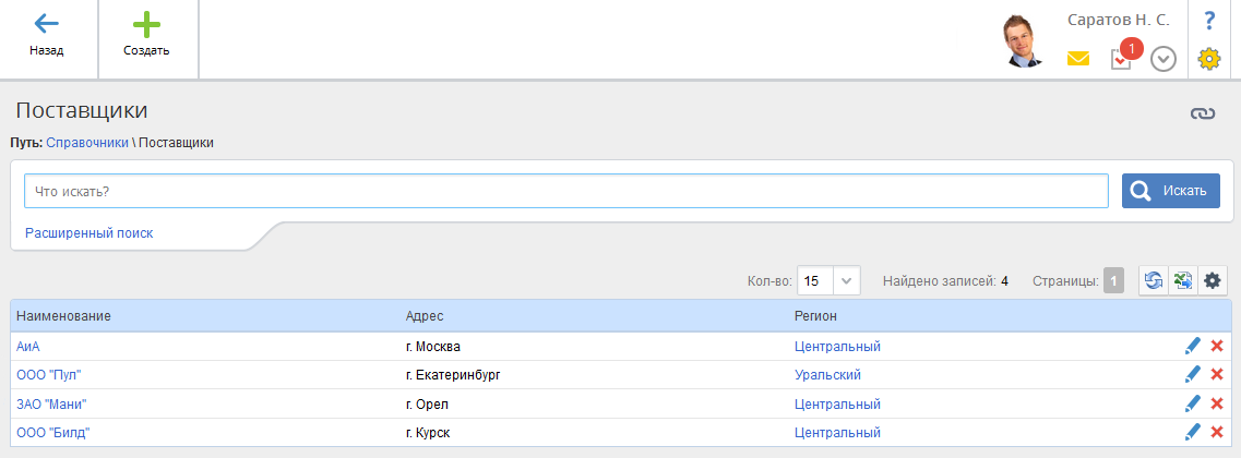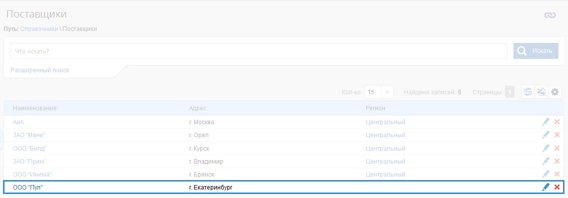 – удаление записи справочника. При удалении записи справочника все ссылки на нее в других объектах будут обнулены. Например, при удалении записи Уральский регион из справочника Регион, все записи справочника Поставщики, в которых в поле Регион было выбрано значение Уральский регион, будут иметь пустое значение в этом поле (рис. 4). Также при создании записи справочника Поставщики данный регион пропадет из списка при выборе значения поля Регион.