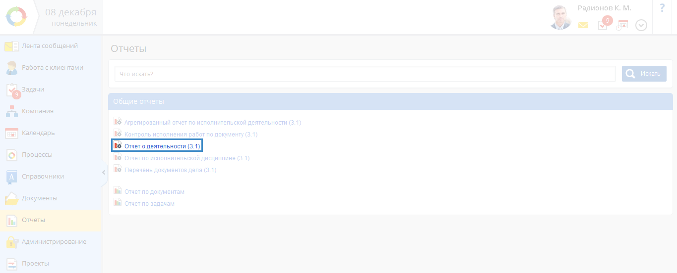 Рис. 1. Раздел "Отчеты". Ссылка "Отчет о деятельности"