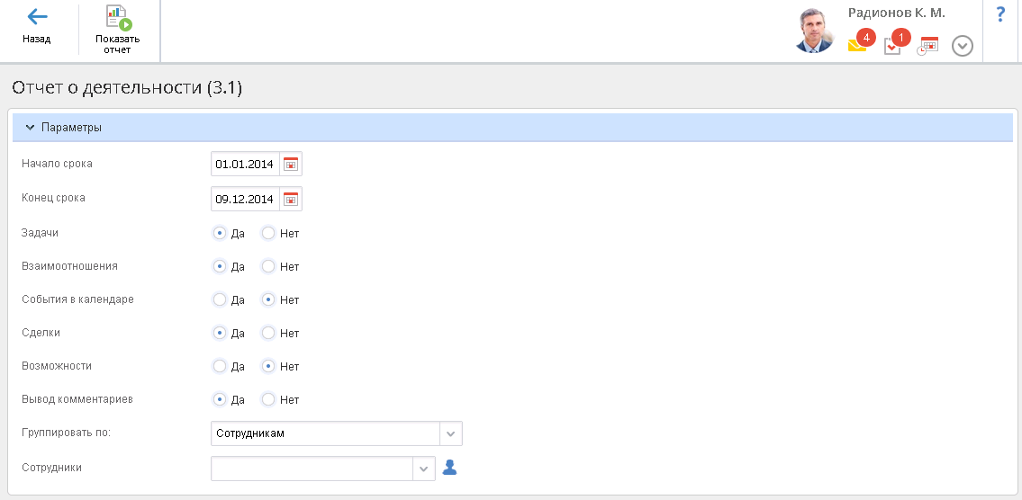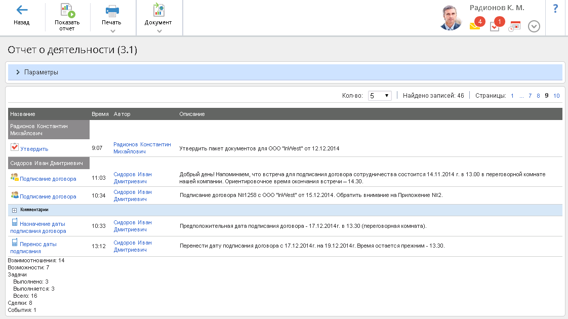 Отчет о деятельности отображает все задачи, взаимоотношения, события из календаря, сделки и возможности за определенный промежуток времени по выбранным пользователям системы ELMA, а также комментарии к ним. Отчет о деятельности может быть сформирован как для одного пользователя системы, так и для нескольких. Группировка данных в отчете осуществляется по пользователям или датам.