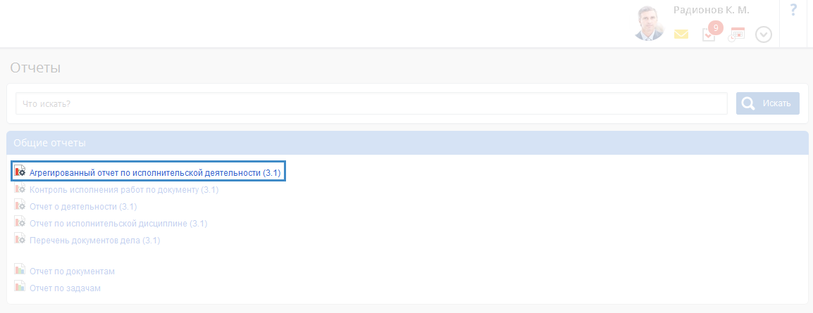 Рис. 1. Раздел "Отчеты". "Агрегированный отчет по исполнительской деятельности"