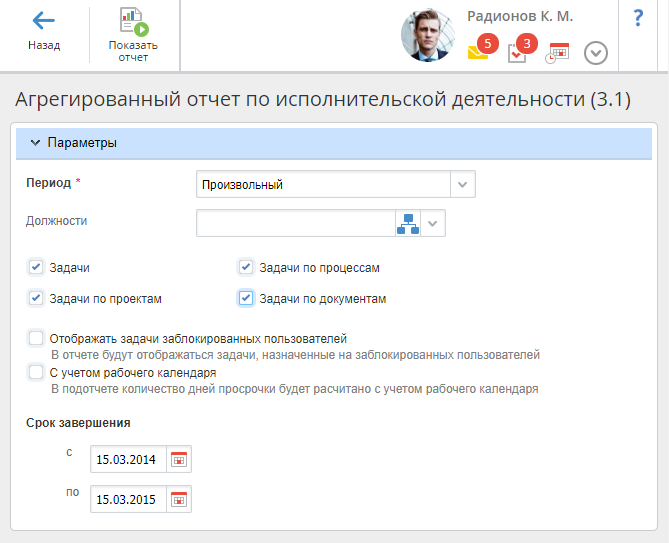 Период *– временной период, за которой будет сгенерирован отчет. В данный период входят все задачи, срок завершения которых попадает в указанный период. Поле является обязательным для заполнения.