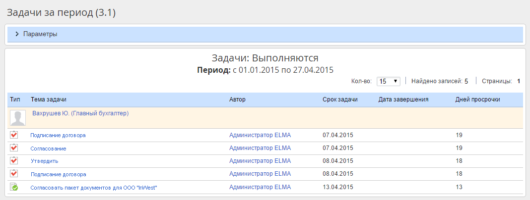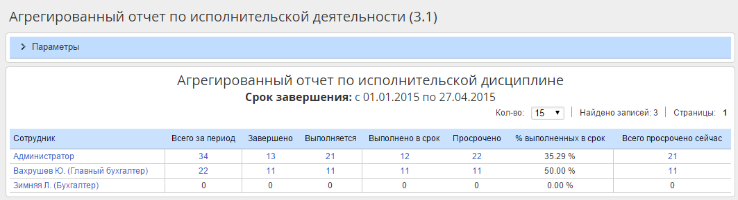 Агрегированный отчет по исполнительской деятельности отображает сводную статистику по задачам пользователей системы ELMA за определенный период времени: