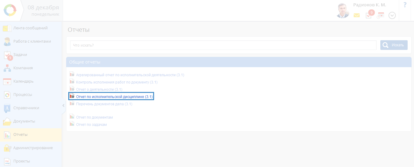 Рис. 1. Раздел "Отчеты". "Отчет по исполнительской дисциплине"
