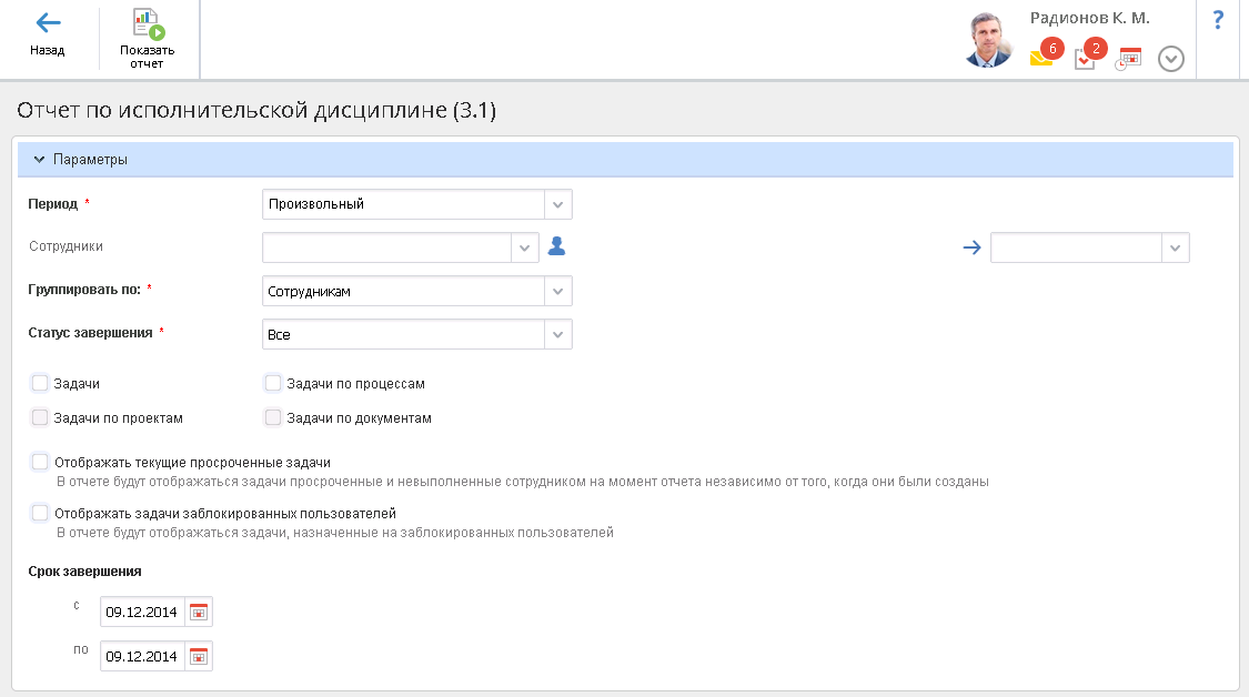 Отображать текущие просроченные задачи – возможность установки отображения просроченных на момент генерации отчета задач. В данном параметре не учитывается дата создания задачи.