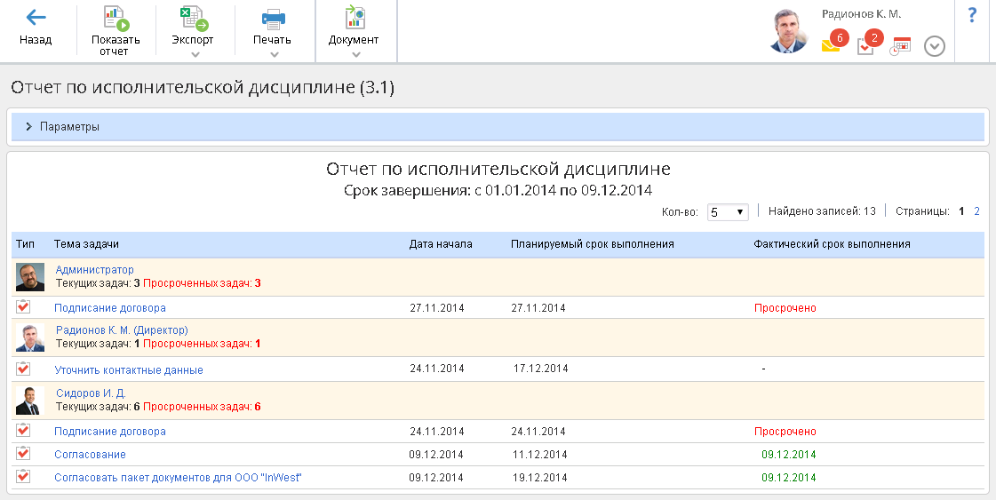 Отчет по исполнительской дисциплине отображает детализированную информацию по задачам пользователя системы ELMA за выбранный период времени: общий список задач, выполненные в срок, просроченные и т.д.. Набор столбцов в таблице изменяется в зависимости от выбранного варианта группировки. В отчете по исполнительской дисциплине отображаются только те задачи, планируемый срок (поле Срок выполнения на странице задачи) выполнения которых находится в пределах заданного в отчете периода.