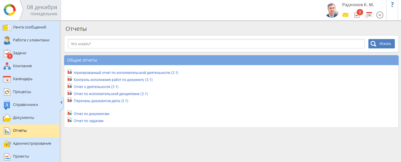 В данном разделе отображаются все доступные текущему пользователю отчеты. Отчет это выборка данных, систематизированных по определенным критериям и предназначенных для проведения анализа деятельности пользователей или компании в целом.