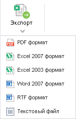 При нажатии на кнопку Экспорт или пиктограмму появляется выпадающее меню, в котором необходимо выбрать один из форматов, в который будет экспортирован текущий отчет: