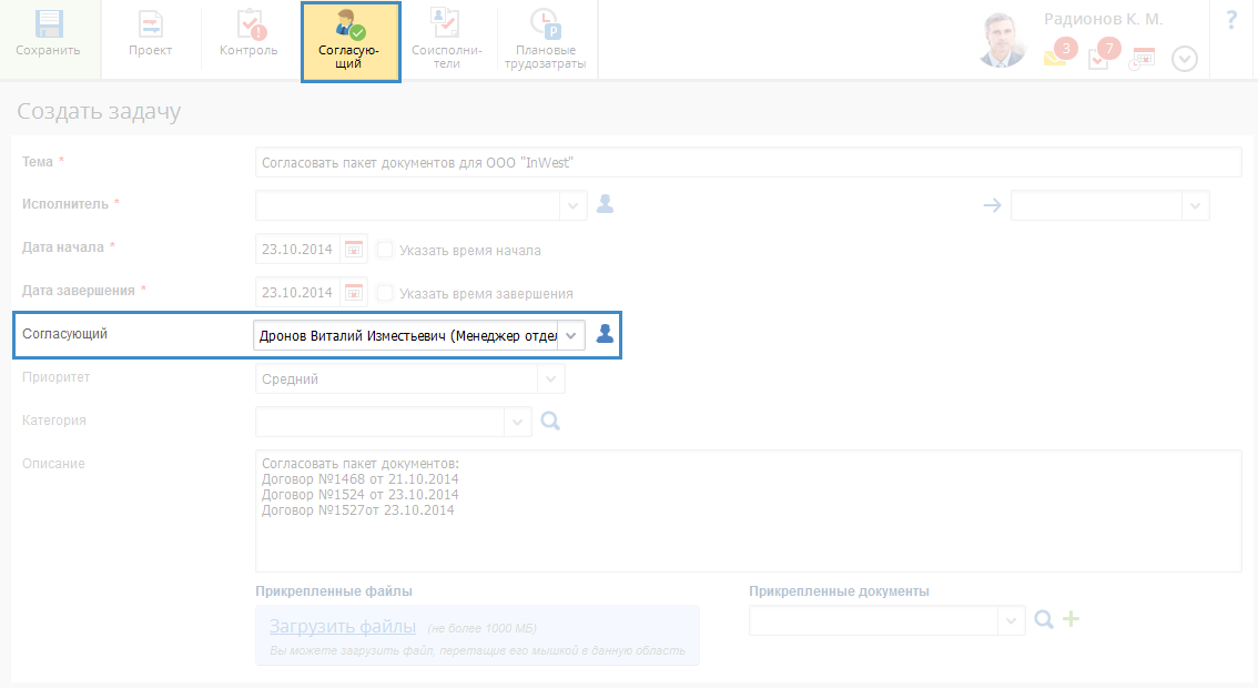 при создании задачи в верхнем меню страницы нажать кнопкой мыши на кнопку Согласующий и в появившемся поле Согласующий (рис. 1) выбрать необходимого пользователя;