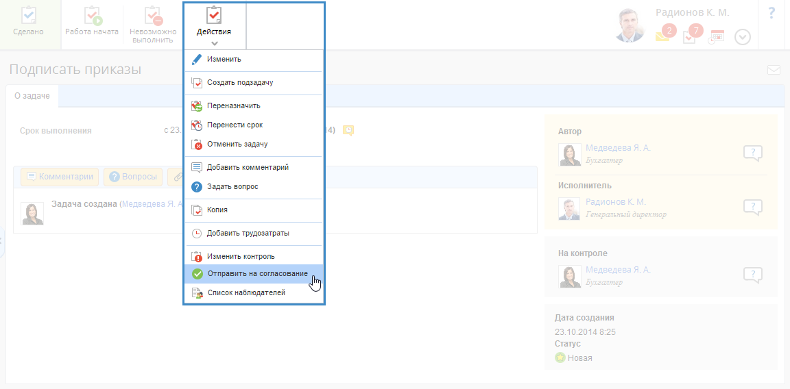 Рис. 2. Кнопка "Действия – Отправить на согласование" на странице созданной задачи