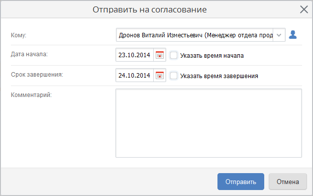 на странице уже созданной задачи нажать кнопкой мыши на кнопку Действия - Отправить на согласование (рис. 2) и во всплывающем окне (рис. 3) выбрать необходимого пользователя, дату начала и завершения согласования, а также доступно поле для ввода комментария. Данным способом задача может быть отправлена на согласование только самим автором или исполнителем задачи.