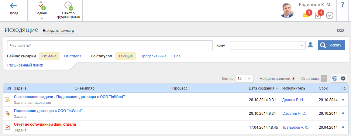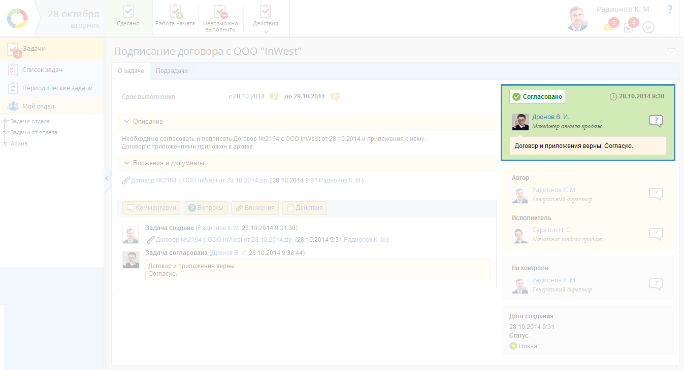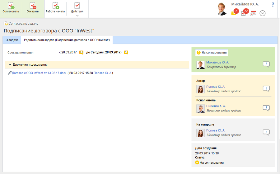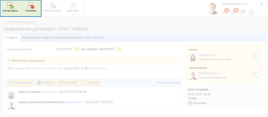 На странице задачи в верхнем меню (рис. 4) согласующий пользователь может нажать кнопкой мыши на кнопку Согласовать или Отказать (в зависимости от принятого решения).