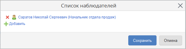 Вы можете добавить наблюдателей задачи. Наблюдатель – это пользователь, который отслеживает ход выполнения задачи и является ее подписчиком. Подписанные на задачу пользователи будут получать оповещения обо всех действиях с задачей.