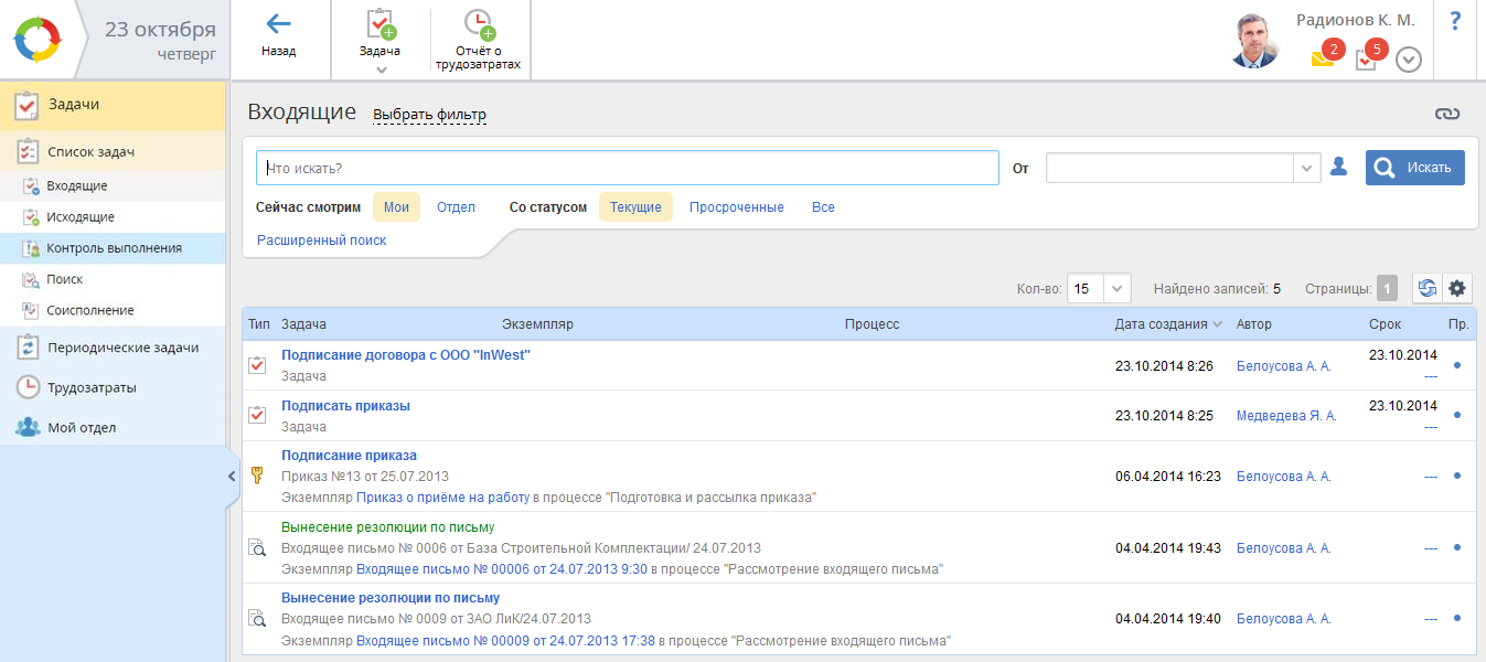 Исходящие – задачи, назначенные текущим пользователем другим сотрудникам;