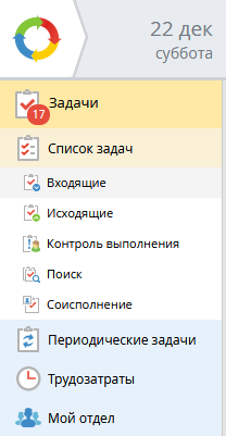 ссылка Задачи, при нажатии на которую осуществляется переход на страницу задач Входящие;