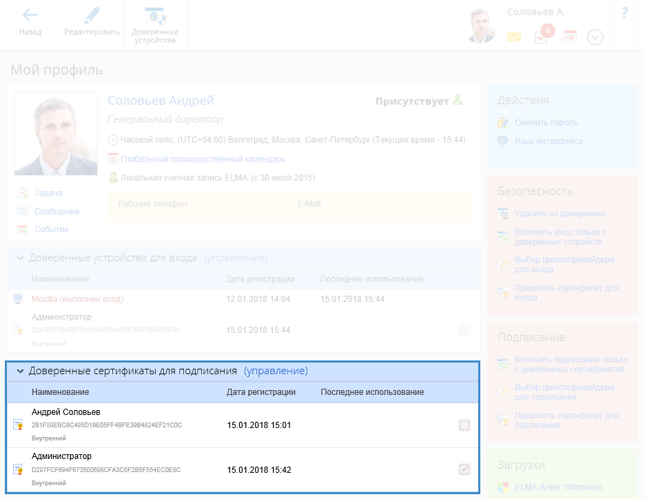Рис. 1. Профиль пользователя. Панель "Доверенные сертификаты для подписания"