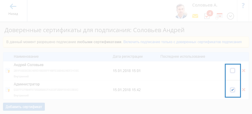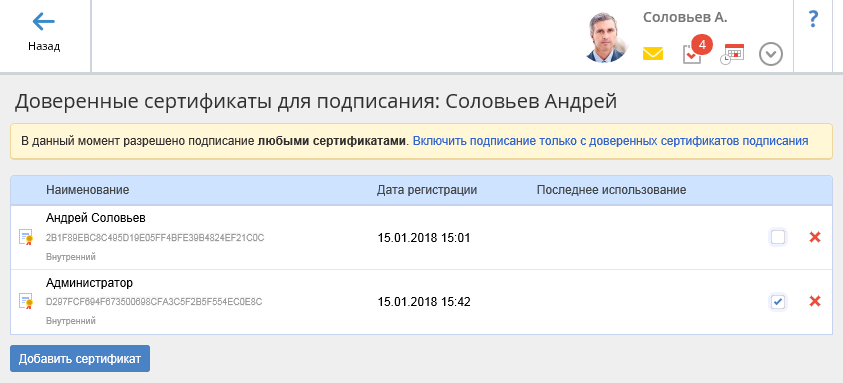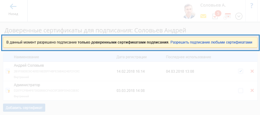 После этого на странице со списком доверенных сертификатов будет отображено соответствующее предупреждение (рис. 10), а в профиле пользователя в блоке Подписание появится кнопка Отключить подписание только с доверенных сертификатов (рис. 11).