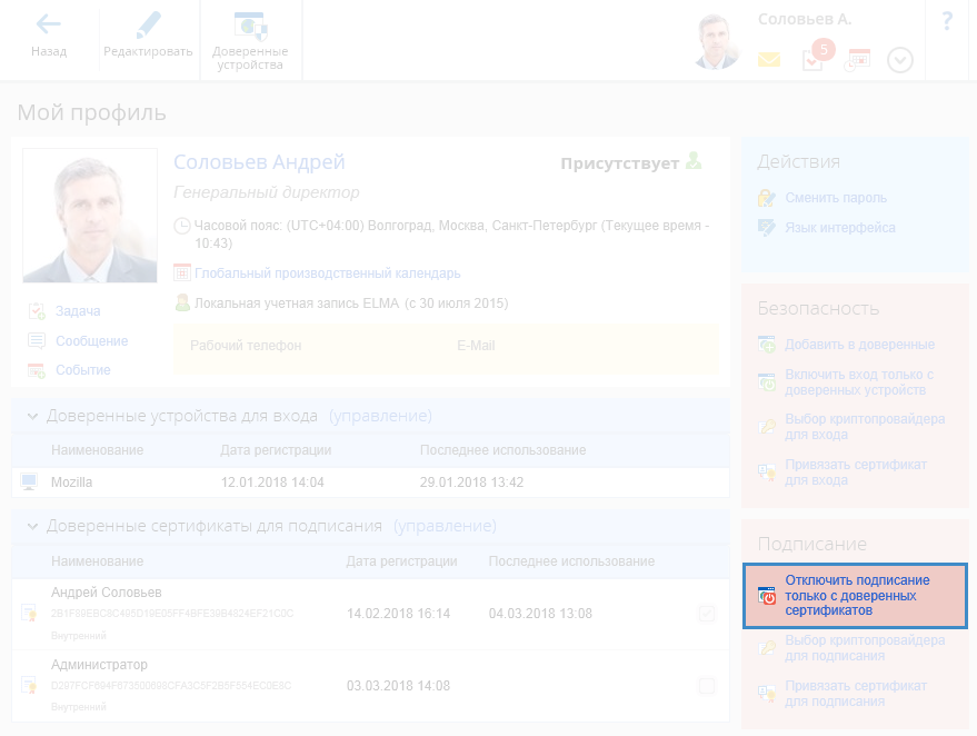 в профиле пользователя (рис.1) в блоке Подписание нажать на кнопку Включить подписание только с доверенных сертификатов.