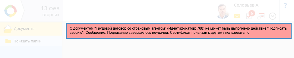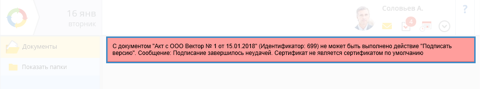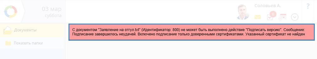 Далее подписание документов с использование ЭЦП будет доступно только с доверенных сертификатов подписания. При попытке подписания документов сертификатами, отсутствующими в списке доверенных, будет отображено соответствующее предупреждение (рис. 12).