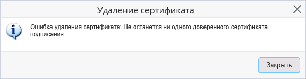 Следует отметить, что в при активной настройке подписания только с доверенных сертификатов невозможно удалить последний оставшийся в списке сертификат подписания из списка доверенных. При попытке удаления такого сертификата будет отображено соответствующее уведомление (рис. 14).