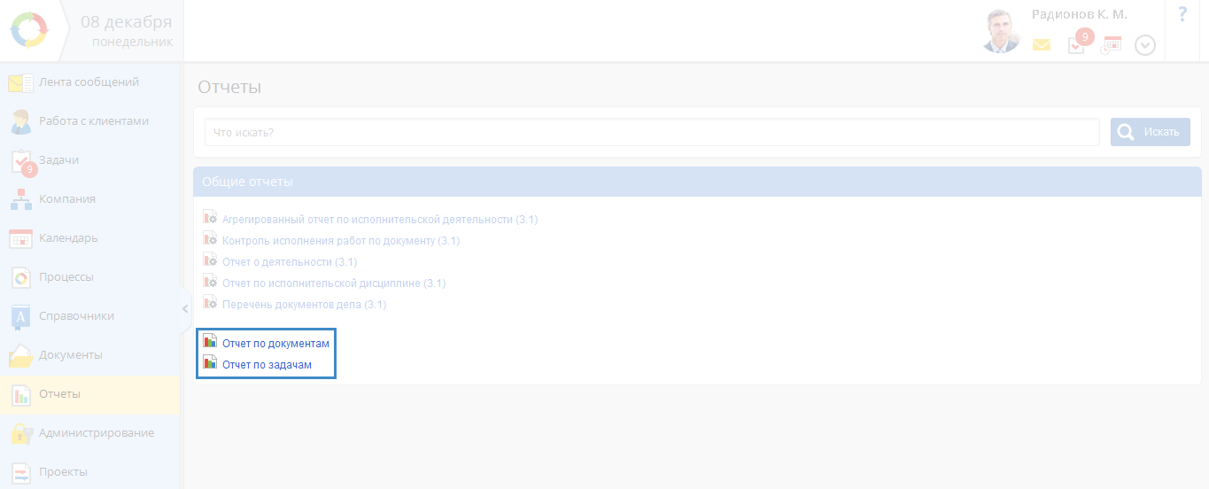 Рис. 1. Раздел "Отчеты". Пользовательские отчеты