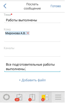 Добавить файл – возможность прикрепления к сообщению файла, находящегося на устройстве пользователя. После нажатия на кнопку Готово форма отправки сообщения будет закрыта.