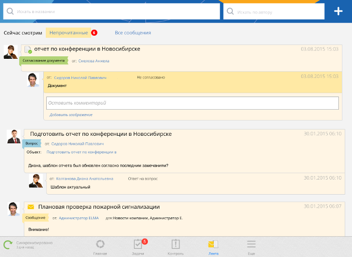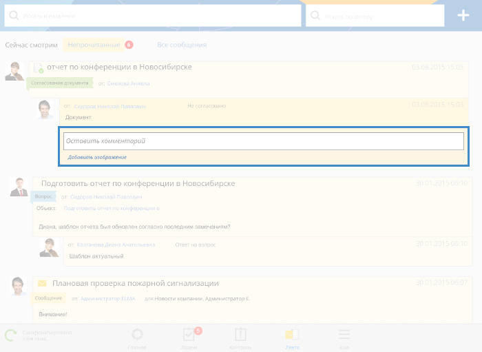 Работа с входящими сообщениями (просмотр, комментирование) осуществляется в разделе Лента.