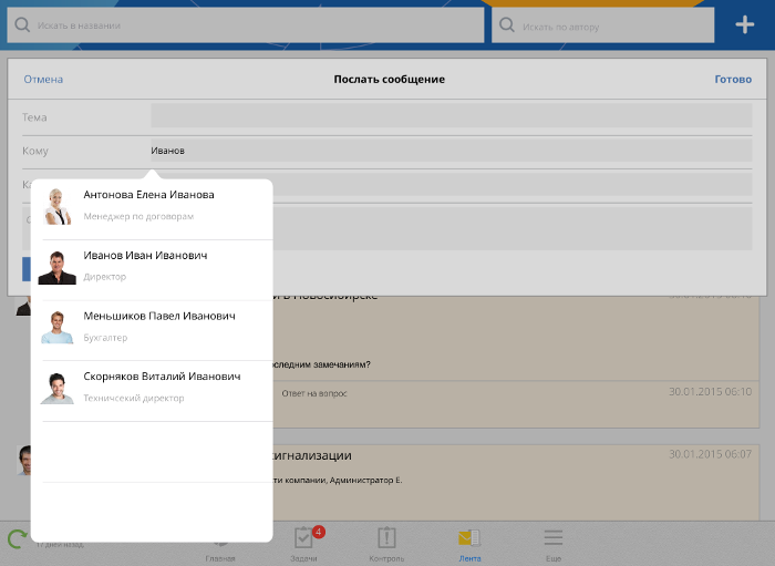 Рис. 4. Платформа iOS. Мобильное приложение ELMA BPM. Страница создания сообщения. Поле выбора получателя сообщения