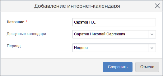 3. В открывшемся окне введите название календаря, выберите доступный календарь и период экспорта. Нажмите кнопку Сохранить. В список могут быть добавлены несколько календарей.