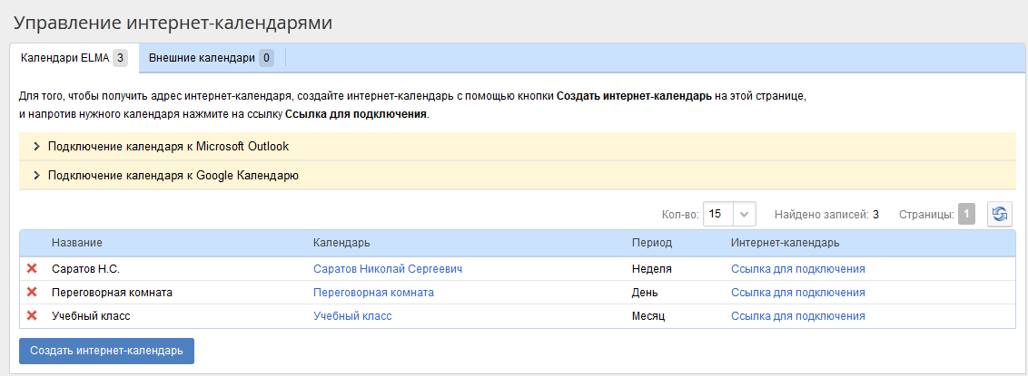 4. На странице Управление интернет-календарями отобразятся записи обо всех добавленных календарях (рис. 3).
