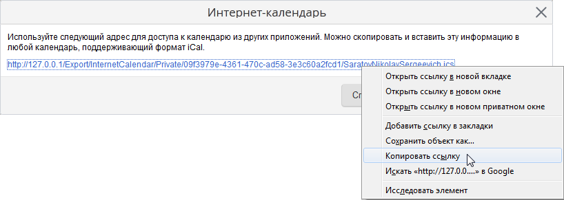 В системе ELMA на странице календаря в верхнем меню нажмите на кнопку Экспорт – Подключить интернет-календарь. Отобразится окно со ссылкой на текущий календарь (рис. 9).