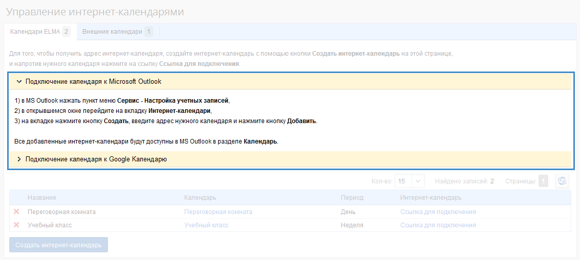 В системе ELMA на странице Управление интернет-календарями размещены две инструкции (рис. 8) по подключению календаря из системы ELMA к программным средствам Microsoft Outlook и Google Календарь. По умолчанию данные инструкции находятся в свернутом состоянии. Для раскрытия инструкции необходимо нажать кнопкой мыши на название требуемой инструкции.