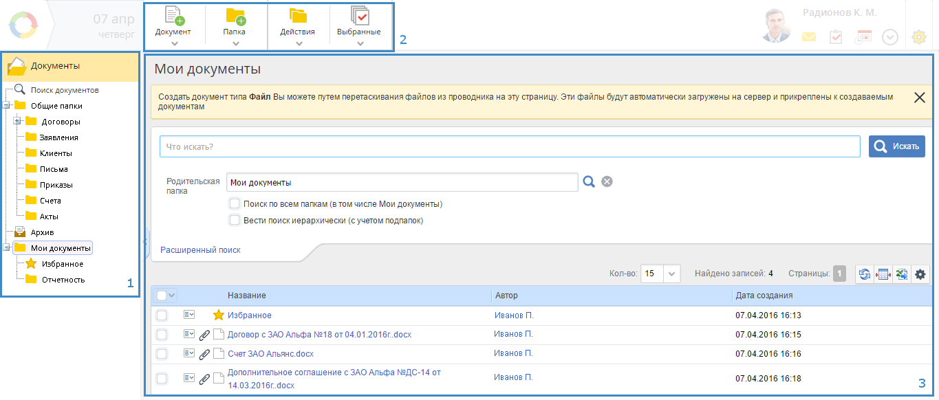 На рис. 1 цифрой 3 выделена рабочая область хранилища документов. В рабочей области хранилища документов располагается форма быстрого поиска документов и таблица, содержащая папки и документы, расположенные в выбранной директории.