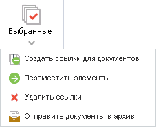 При нажатии на кнопку Выбранные или пиктограмму появляется выпадающее меню, которое предлагает осуществить следующие групповые операции с выбранными документами: