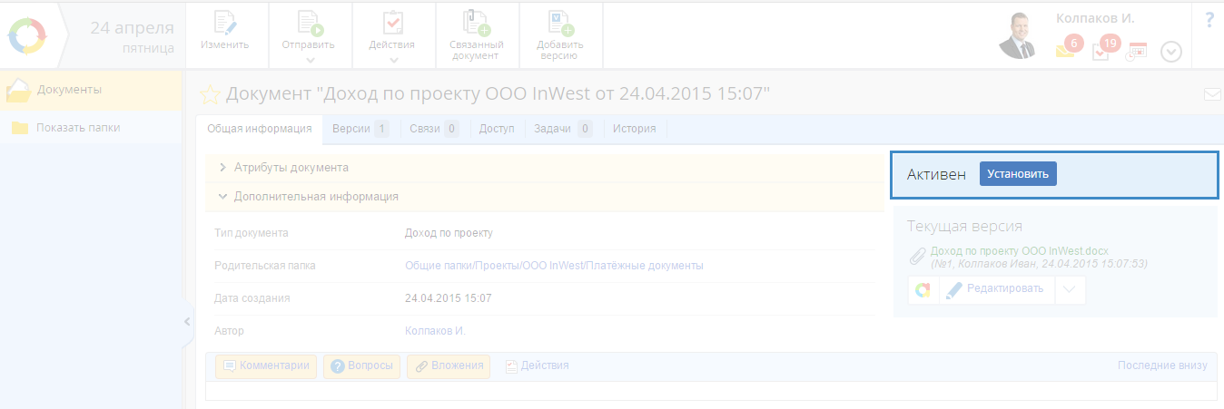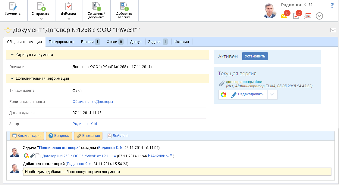 Обсуждение документа – отправка сообщения по документу пользователям или в информационный канал. Просмотр истории обсуждения доступен на панели истории действий в карточке документа;